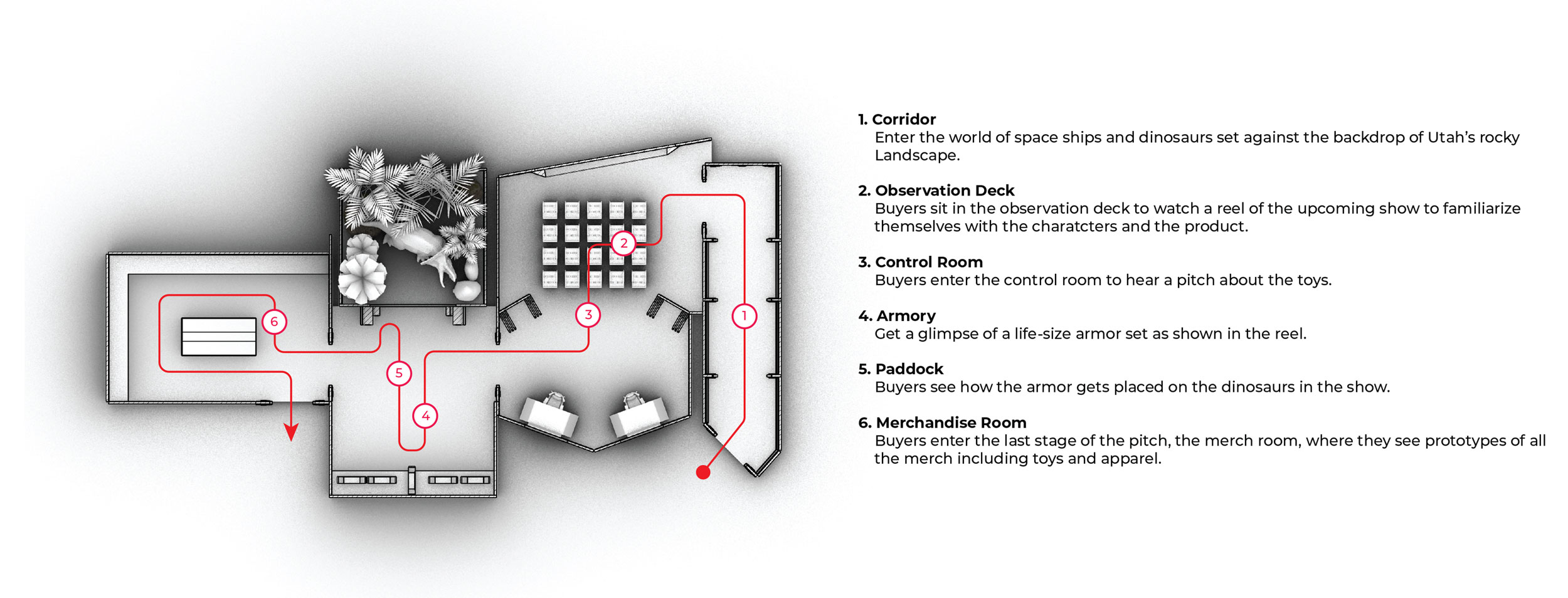 present-day elements to reflect the show's theme. I then created 3D renders to communicate the visual and spatial flow, and designed graphics for all the floors and other