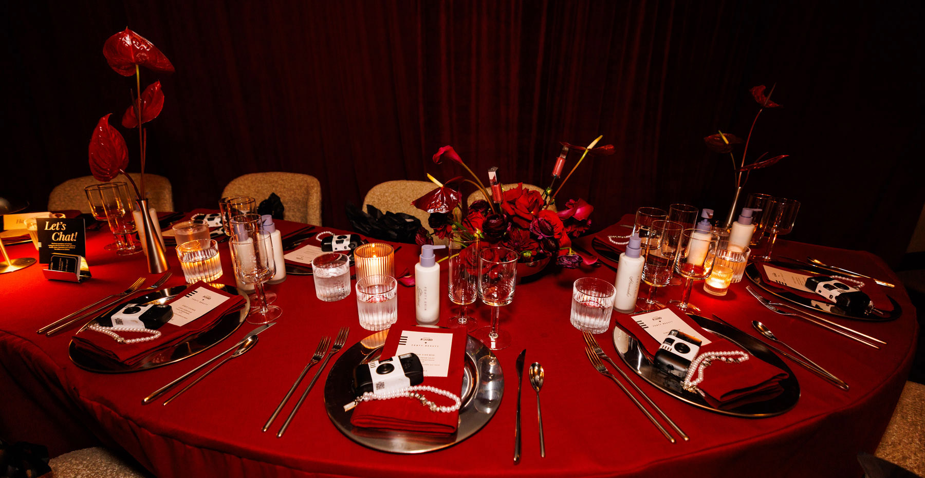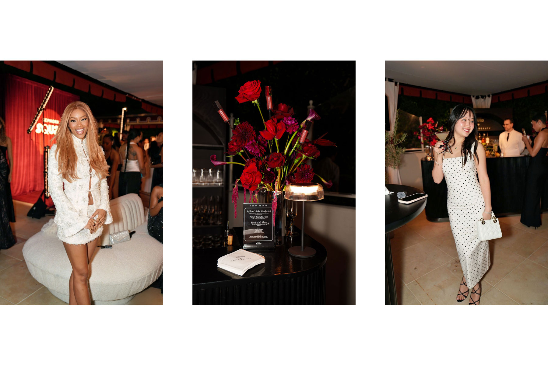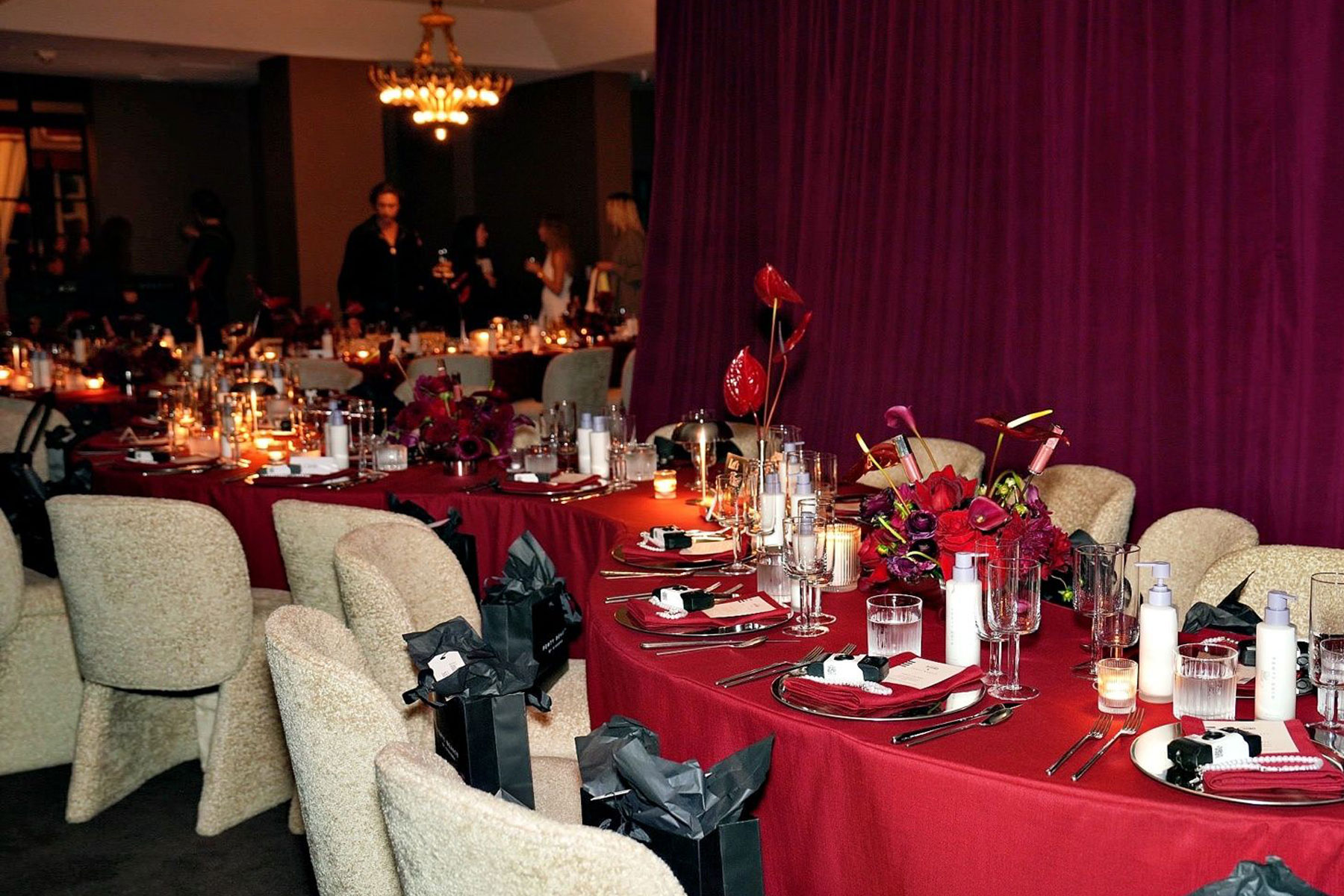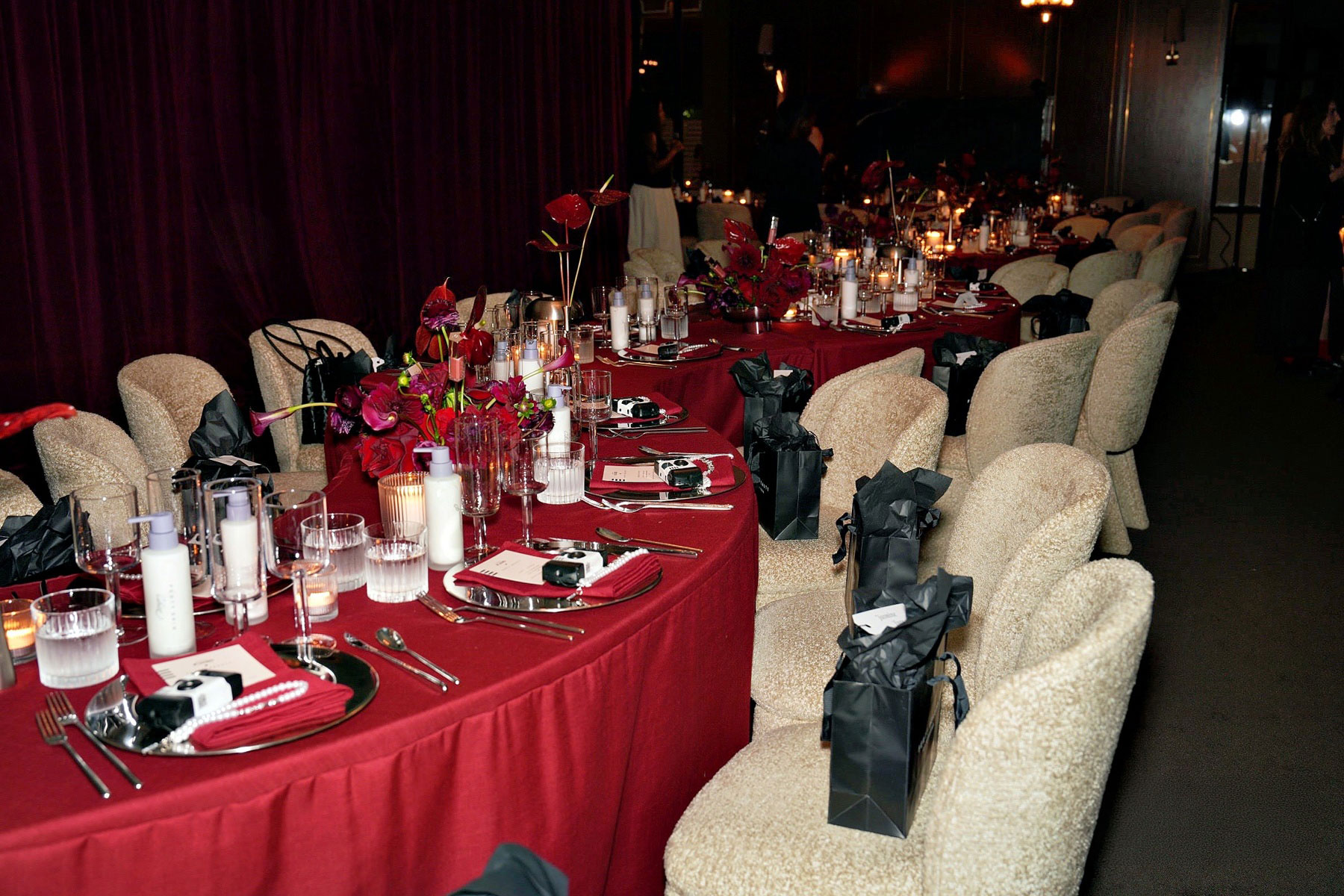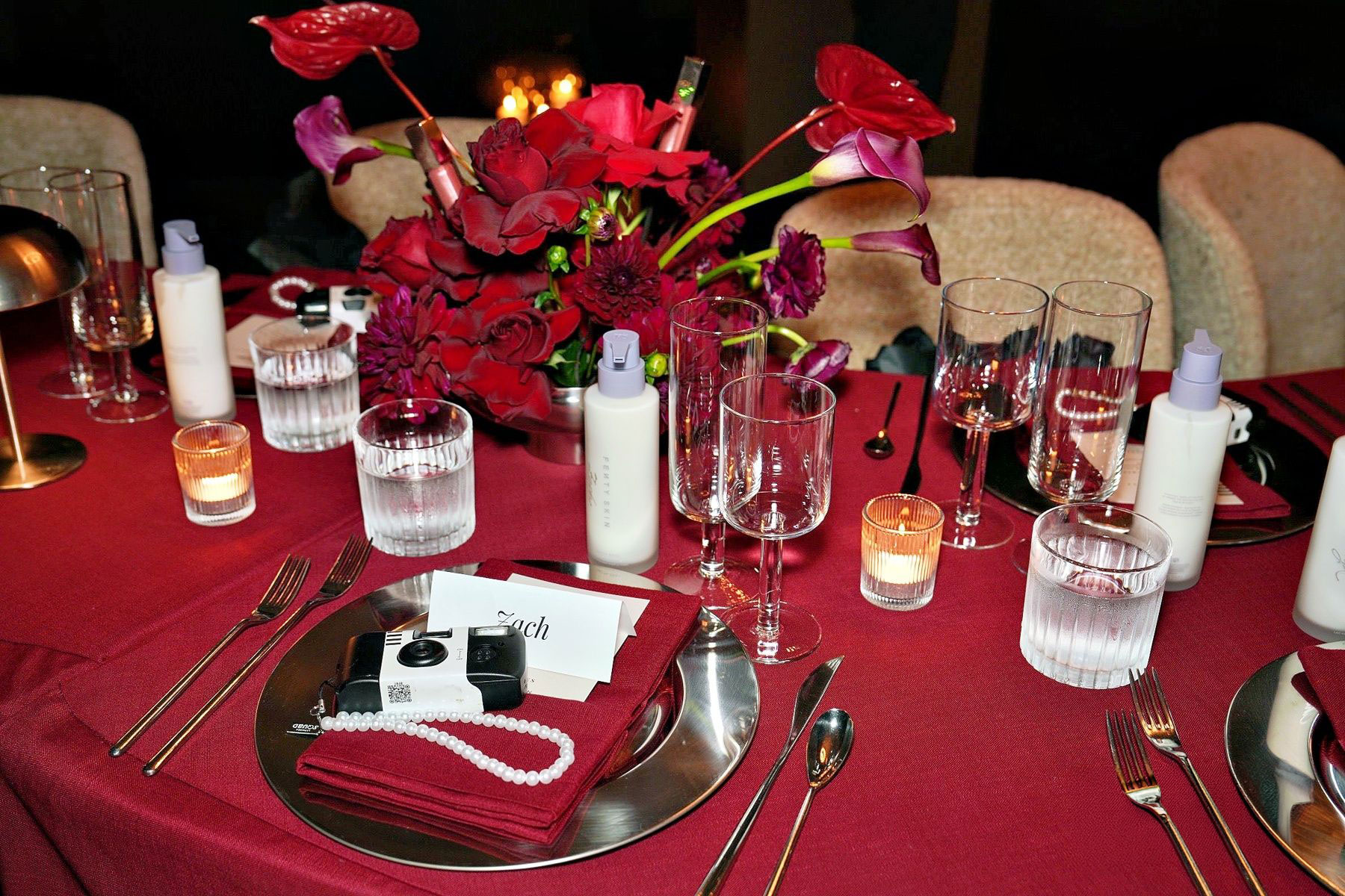 We kicked off the celebration with the creators’ first toast at Duke’s, Sunset Tower’s newest hotspot. Co-hosted by Fenty Beauty, the night unfolded against luxe red tablescapes and layered brand moments – from custom cocktails and lush florals to curated product displays and an entry video moment.