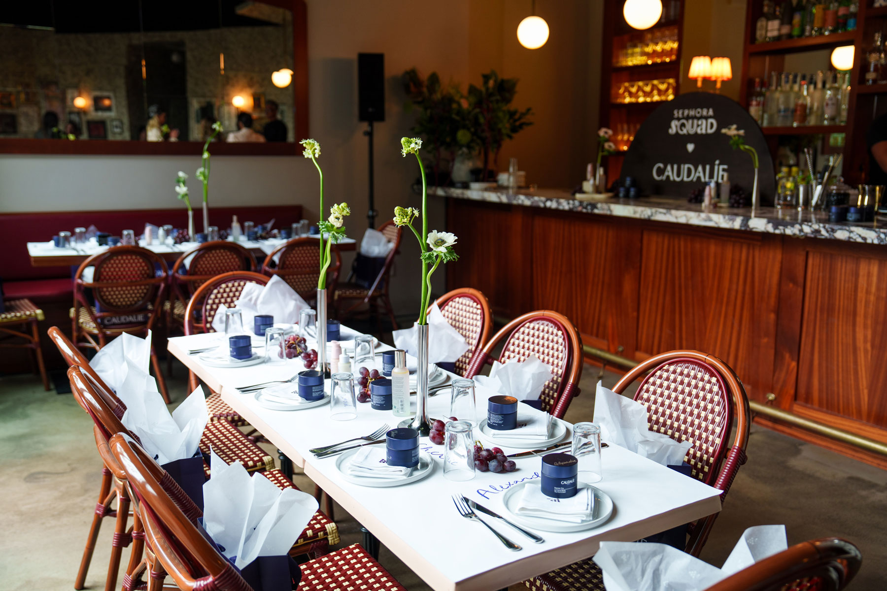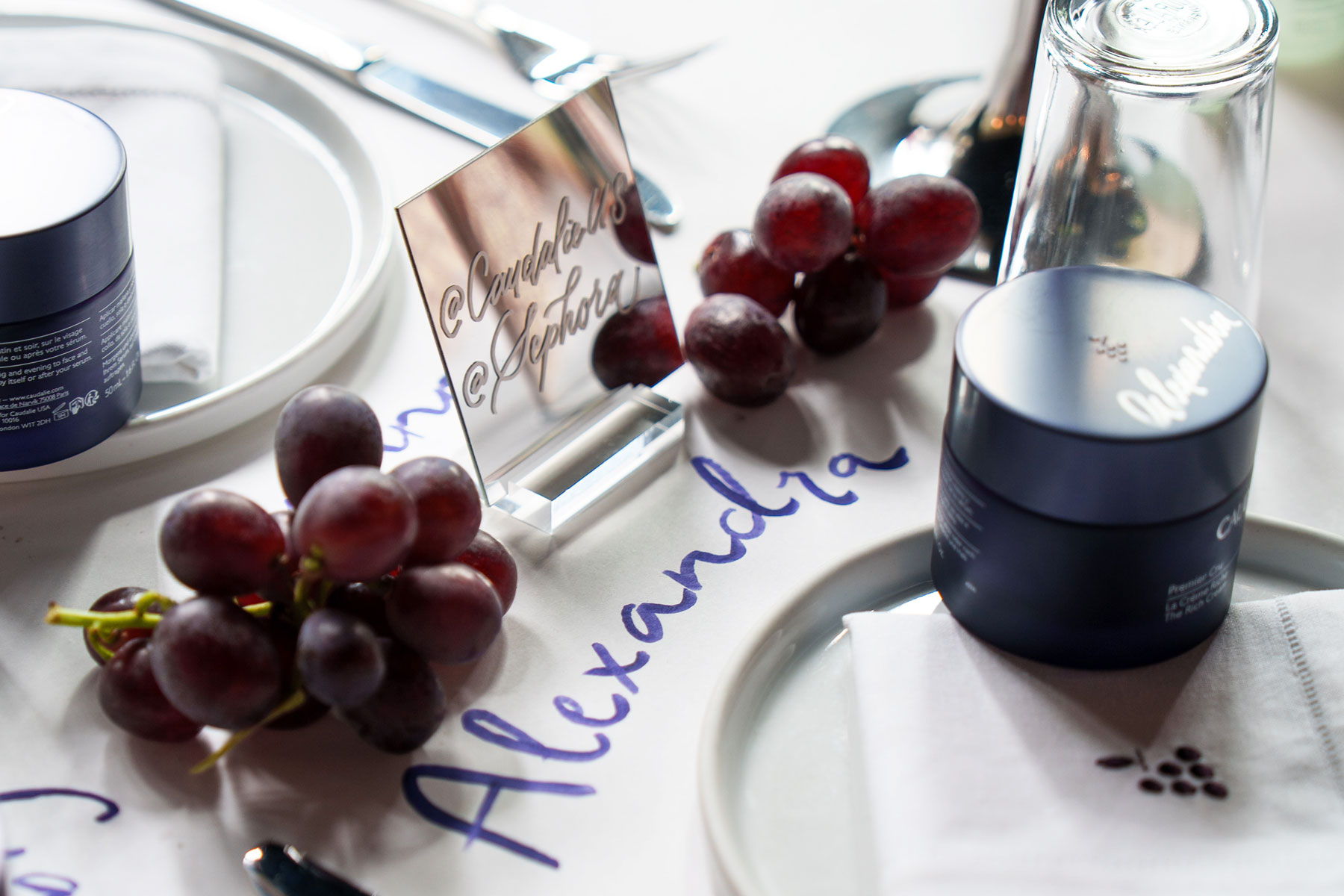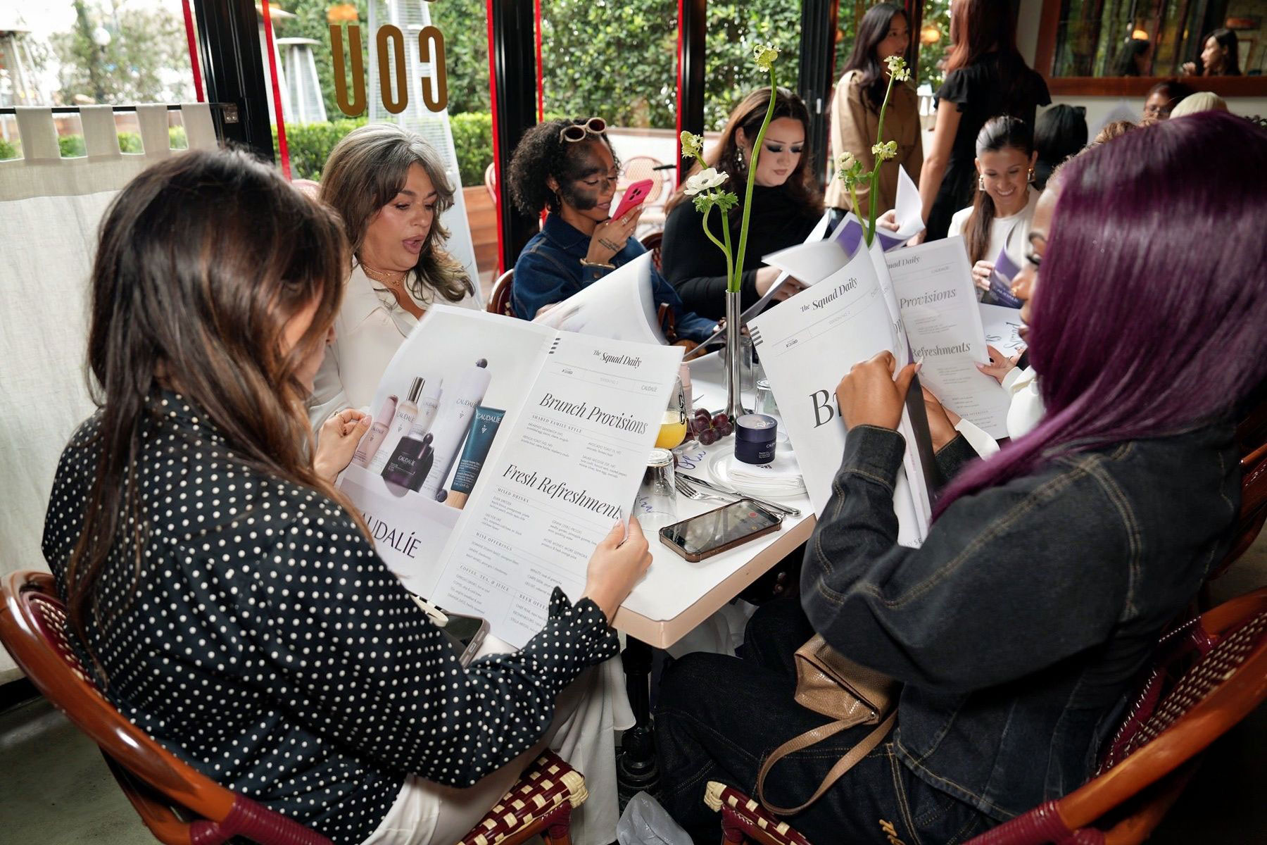 On the second day, the Squad headed to Cou Cou for a Morning brief inspired brunch, co-hosted by Caudalie. Creators bonded over a round of Never Have I Ever around custom newspaper-style menus, handwritten name cards, and curated Caudalie products and signature purple grapes that lined the tables.