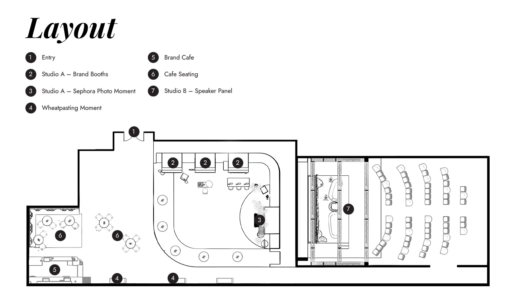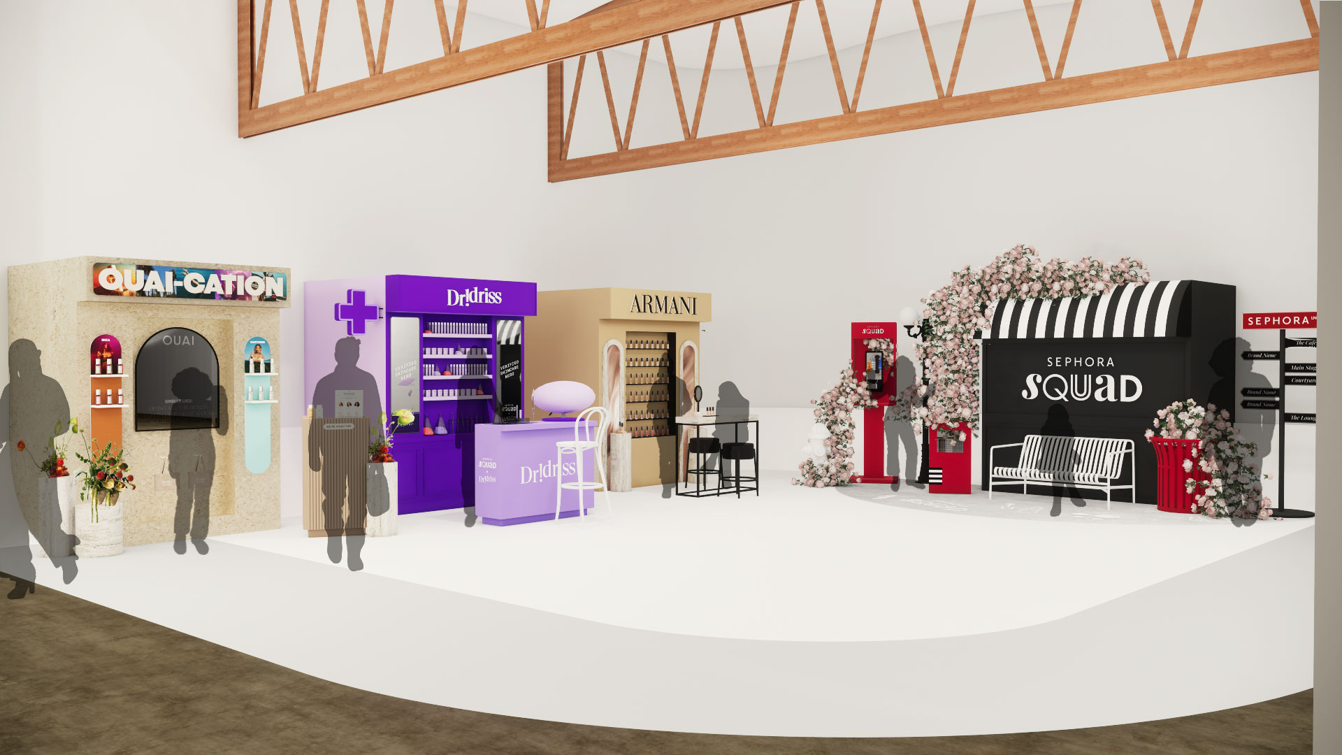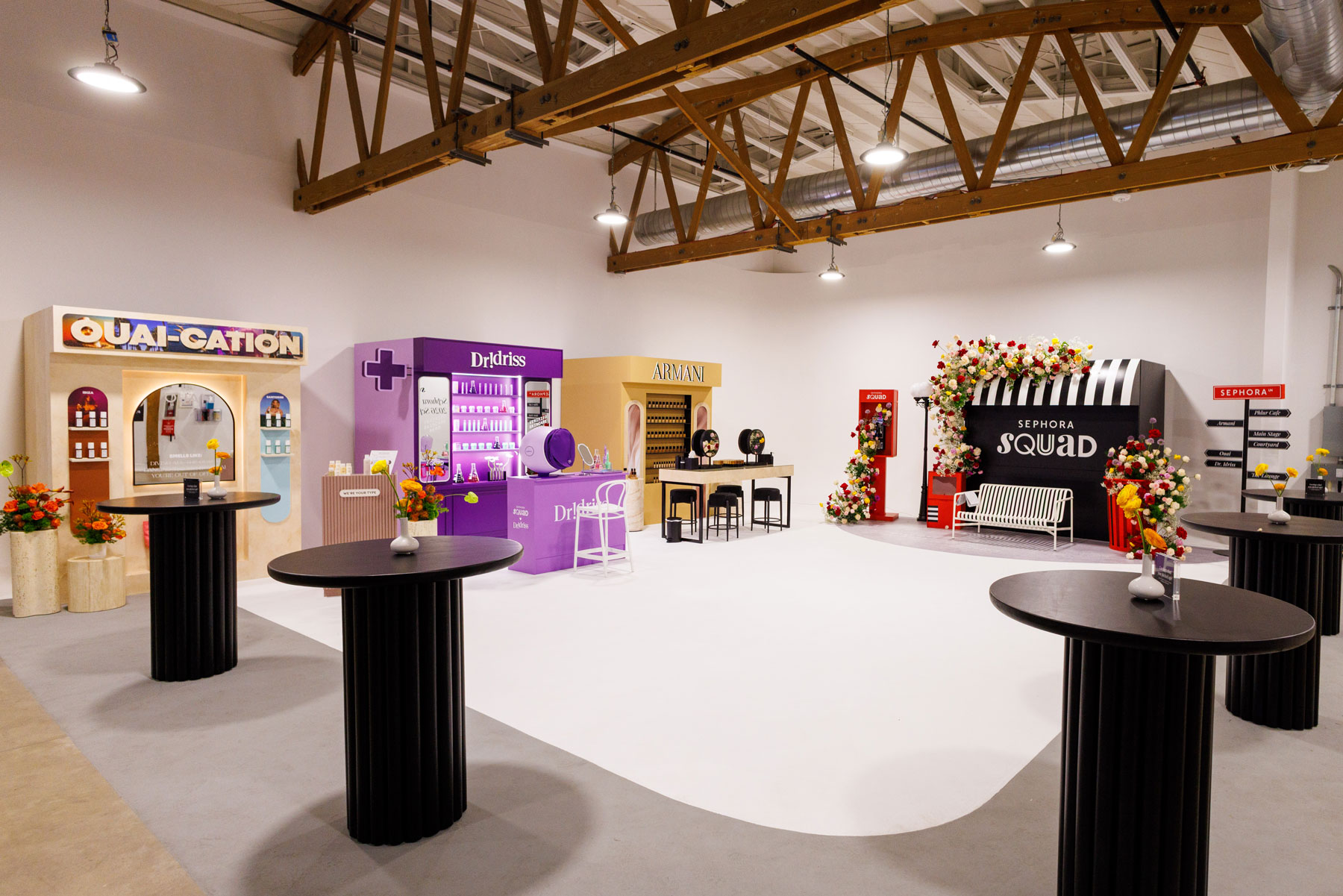 The brand booths were built in collaboration with our partner brands: Armani, Dr. Idriss, Ouai, and Phlur. Armani was inspired by a sleek high-end boutique,